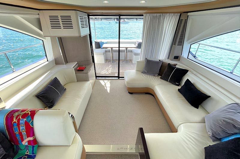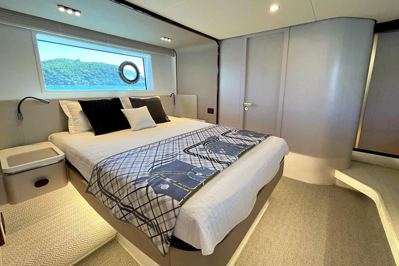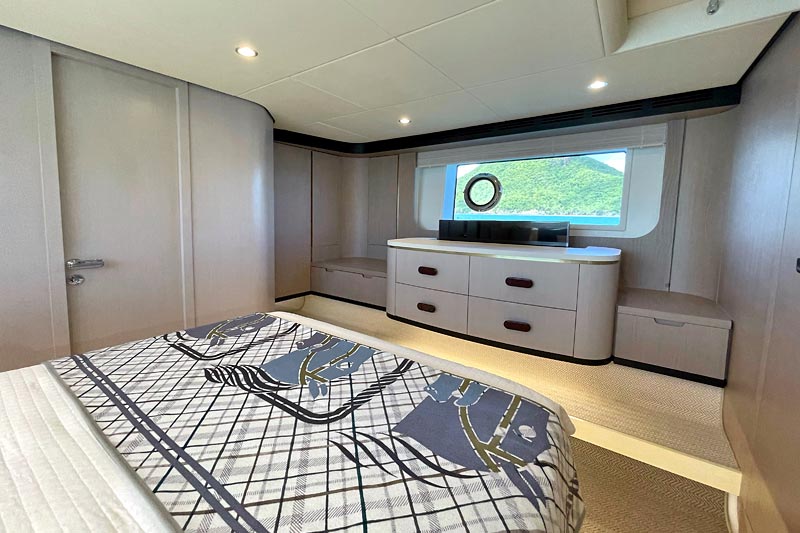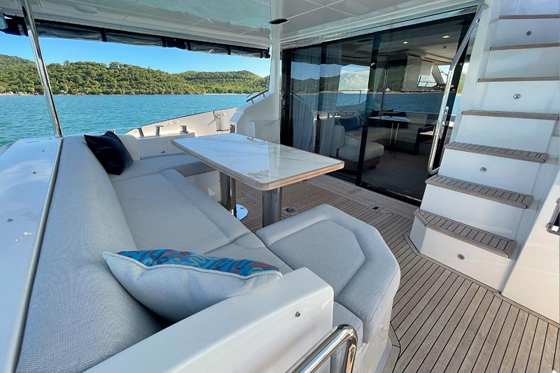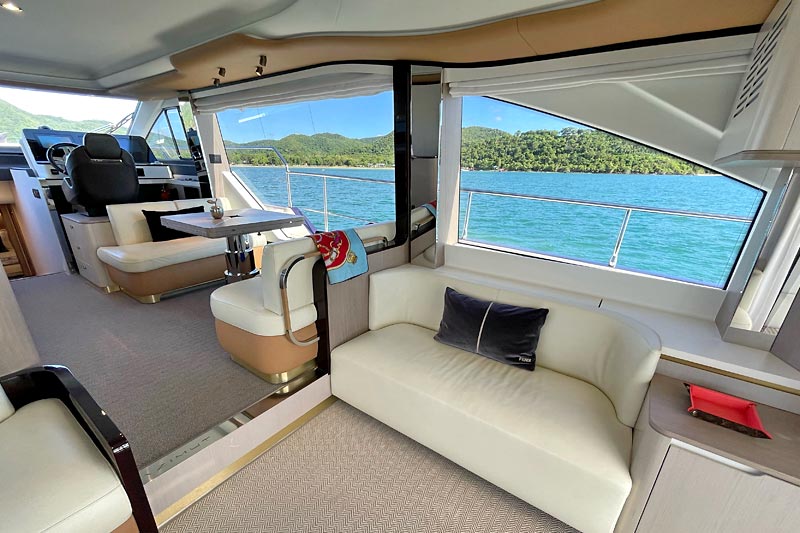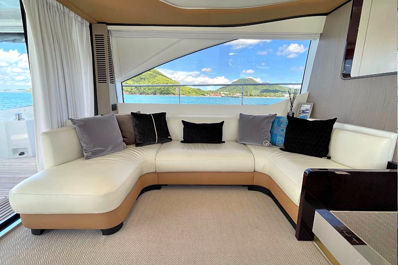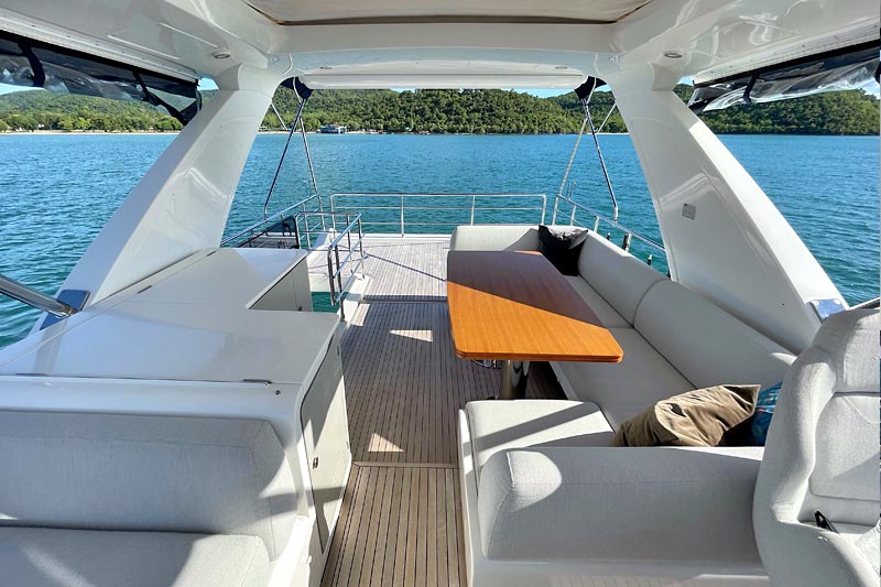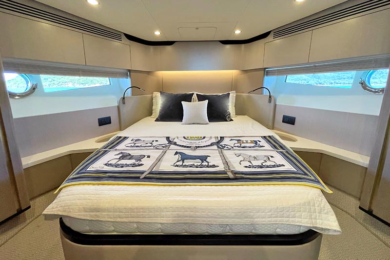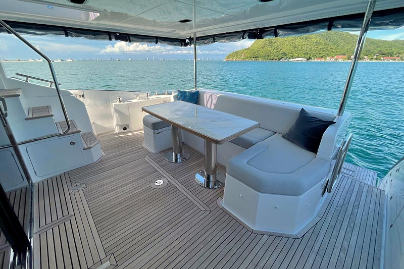 The spacious flybridge delivers breathtaking panoramic views, while the modern interior features plush furnishings, refined finishes, and large windows creating a bright and relaxing atmosphere. Guests can enjoy alfresco dining, sunbathe on the foredeck, or unwind in the fully air-conditioned saloon.