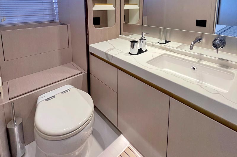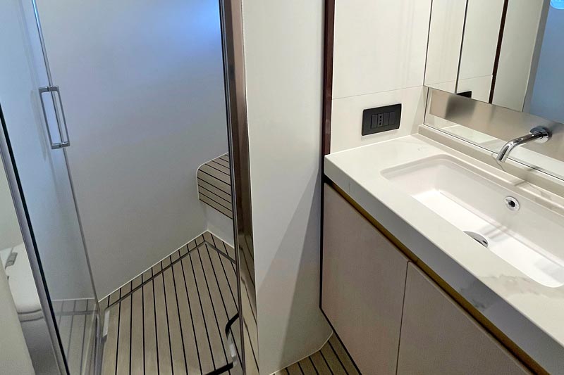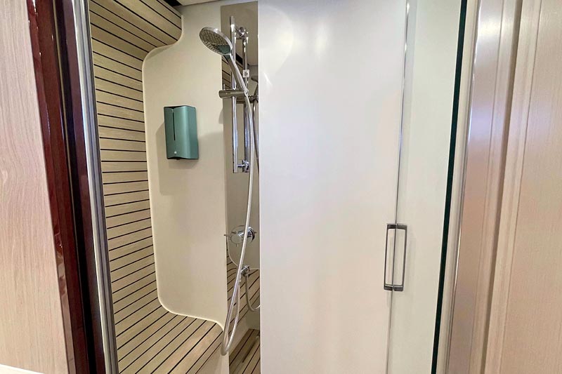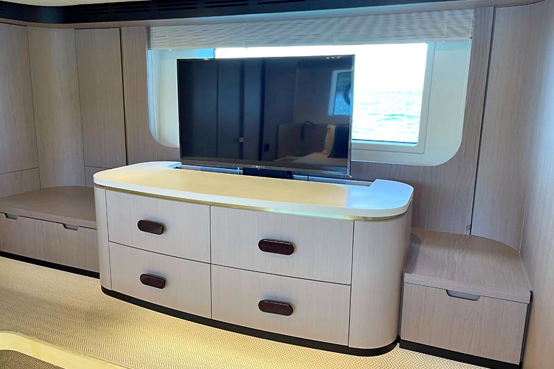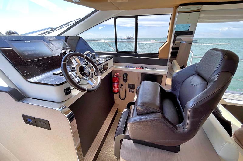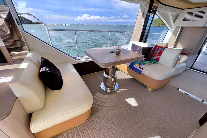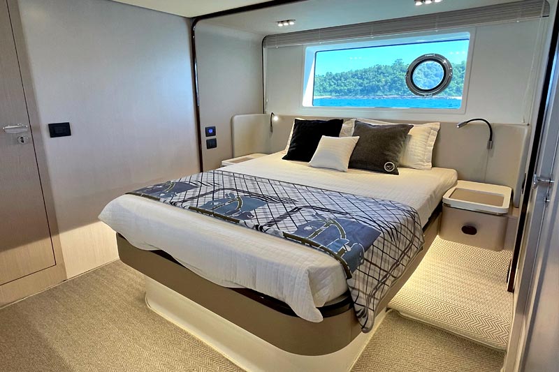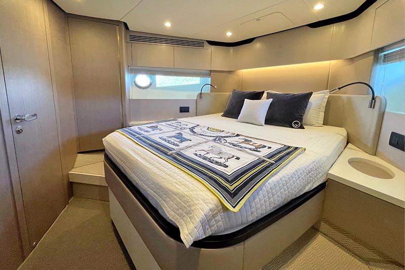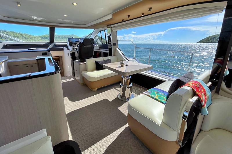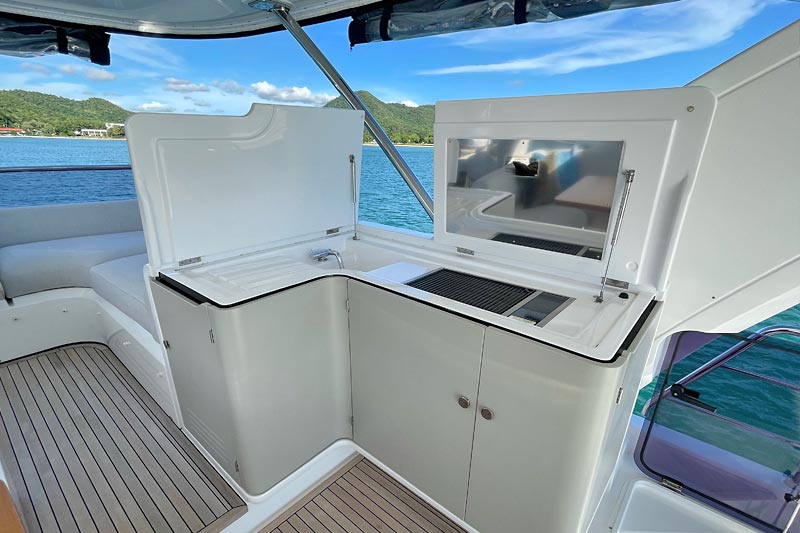 The spacious flybridge delivers breathtaking panoramic views, while the modern interior features plush furnishings, refined finishes, and large windows creating a bright and relaxing atmosphere. Guests can enjoy alfresco dining, sunbathe on the foredeck, or unwind in the fully air-conditioned saloon.