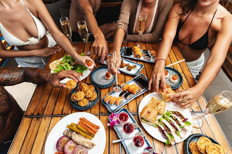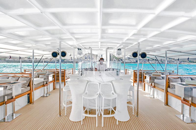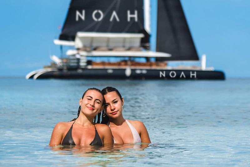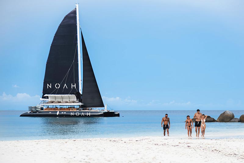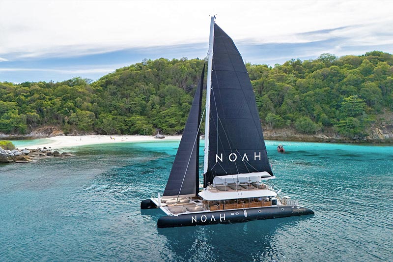 NOAH 73 Sailing Catamaran is a beach club on the sea, hosted on a stylish, spacious boat featuring comfortable sun lounger day beds and a large trampoline. Guests can enjoy a selection of delectable finger foods, ranging from traditional Thai cuisine to sushi, complemented by a bar offering an extensive menu of fine champagnes, spirits, and cocktails.