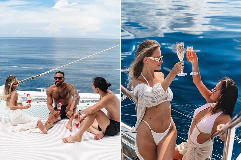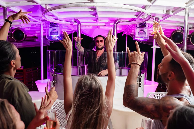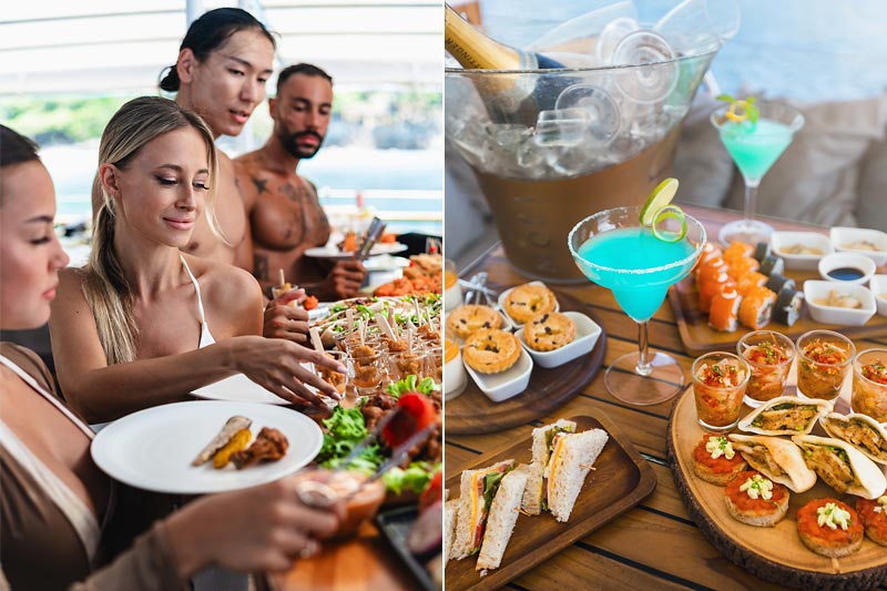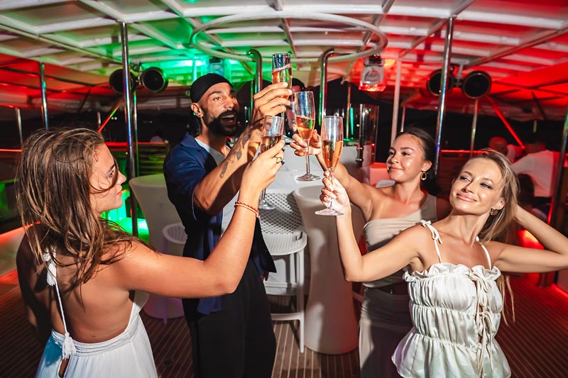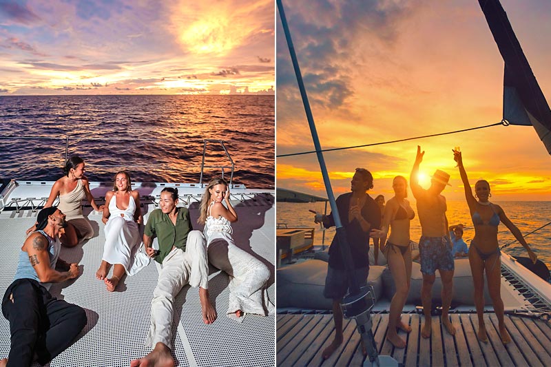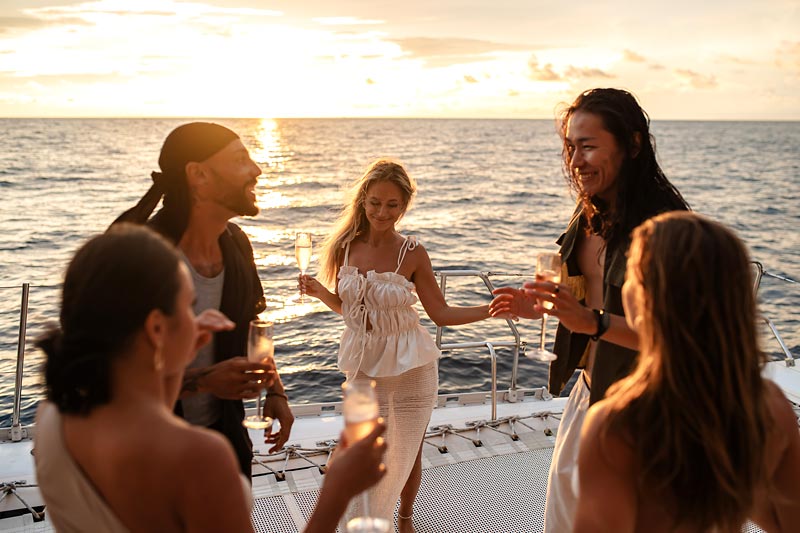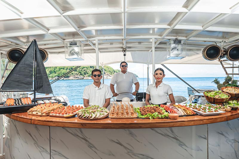 Designed for your comfort, the boat sets the perfect ambiance with our DJ curating a musical journey from relaxing lounge tunes to lively club mixes. Far from the hustle and bustle of the island, our cruise offers a breathtaking day on the crystal-clear waters around Phuket, culminating in a magical sunset.